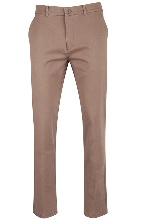 Flat front with side pockets, tailored cut back pockets.