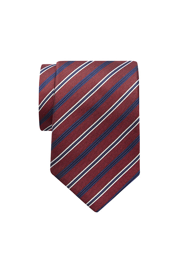 Red tie with diagonal Blue and White design