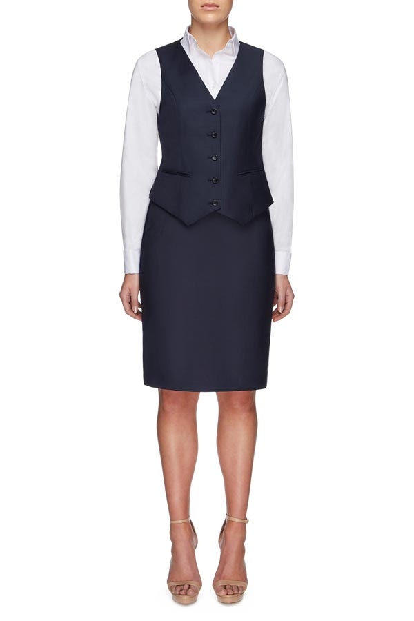 Ladies tailored 5 button vest with lined back and adjuster strap.