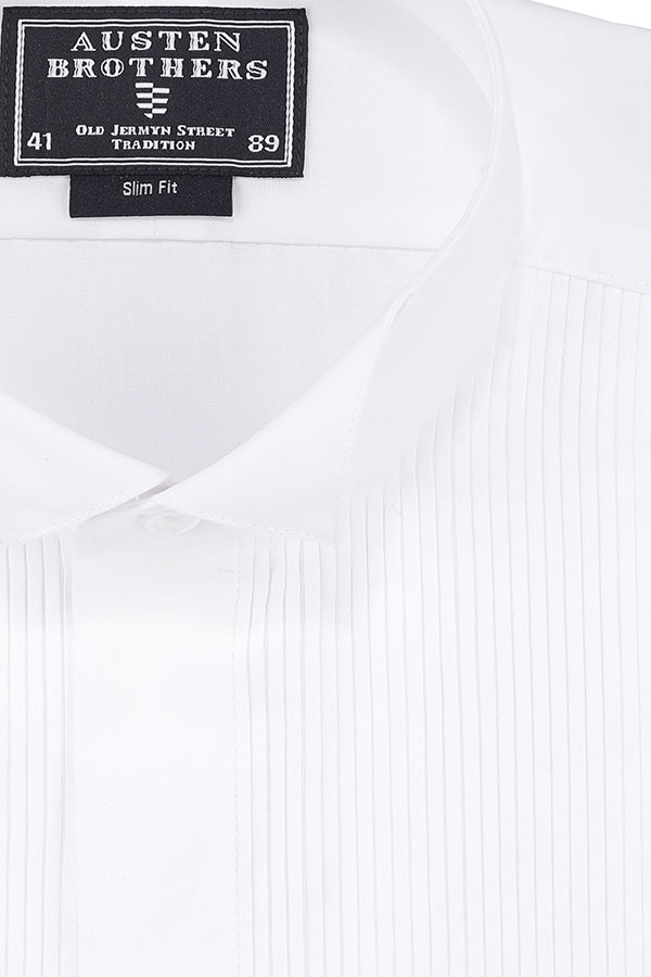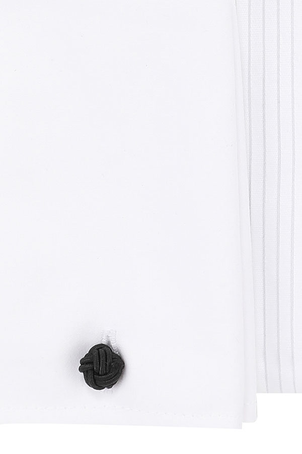 This Shirt is Slim Cut, Regular Sleeve, Double Cuffs with a Winged Collar, concealed buttons with a pleated front.